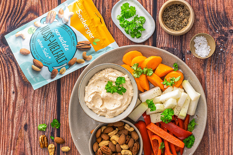 Couper les légumes en morceaux de la taille d'une bouchée et les disposer sur un plat. Mettre la variété de noix Seeberger dans un bol et la disposer sur le plateau de snacks avec le French Onion Dip.